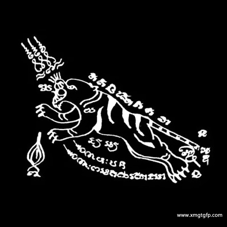 阿赞通蜀两个孩子相继去世以后,阿赞通蜀很伤心很难过,阿赞通蜀就写出和画出老虎的图案和符咒,老虎身上只有五个花纹,三个虎指而且没有虎头。五个花纹代表的是阿赞通蜀五岁死去的孩子,三个虎指代表佛祖,和尚,法本。虎头代表阿赞通蜀失去的孩子。很多人也说因为阿赞通蜀痛失两个孩子,一怒之下把虎头和虎尾巴斩了去。泰国刺符 古法纹身 无头虎 虎踏菩提叶 五月法会预约 阿赞朕甩