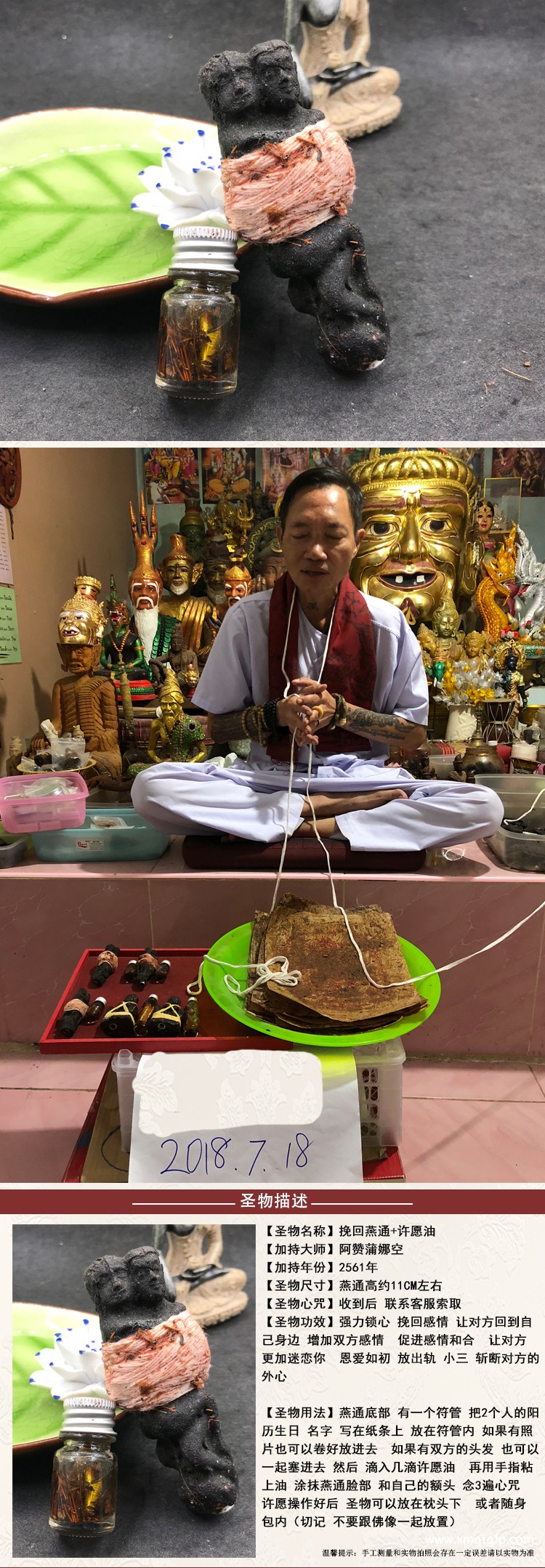 把双方姓名写在一张纸上插入人偶里,可佩戴,可放置家中。功效:感情复合,增进感情的利器,暗恋明恋挽回一切感情问题均可使用,让对方喜欢自己,让对方离不开自己,疼爱自己,死心塌地,招财让对方为你花钱。恭请时师傅更是用秘制珍藏的人缘油再次加持。师傅交代情降人偶有成功率,并且人偶已经在内部测试过,效果非常棒并受到善信们的追捧,这才拿出来分享,非阴牌但是力量非常强,拿在手上就能强烈的感受到。泰国佛牌