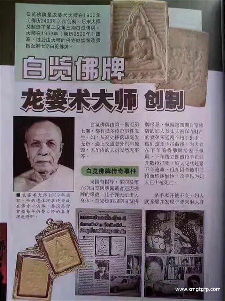 2 在西历1975年左右,泰国郊外一辆小型旅游巴,车上连司机乘客共12人,在行驶途中遇上贼人,贼人手持轻机枪,当贼人抢刧完财物后,其中一乘客高呼救命,这时贼人向各乘客乱枪扫射,射杀后离去,11人死于枪下,一名乘客生还,生还乘客便是佩带白榄佛牌的善信,这事件发生后,佛牌名声一时无两,善信都分分到佛寺恭请白榄佛牌,也有很多生意人佩带后生意起死回生、由一无所有变成家财万贯......等等,因此龙婆术屈白览佛牌四期,价值亦不断上升。屈白榄佛牌对于(娇卡)避险、羊打(人缘)、速纳(运气)、卡楷(生意)均有很好功效。据仿间流传,当你拥有屈白榄佛牌,所有愿望都会得到达成。龙婆术是泰国传奇九大圣僧之一,不论自身的法力与德行,还是对于泰国社会的帮助都是众人皆知的。泰国的公民也好,皇室成员也好,军队将领也好都对这位名师极为尊敬。