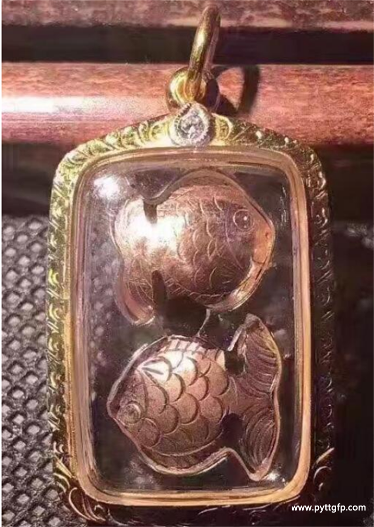 鱼的形象在泰国的佛牌中运用是比较普遍的,一般可做成供奉型的中大型招财鱼,也可做成佩戴型的小型招财鱼,除了佛牌固定自身种类以外,很多师傅的佛牌还会将鱼的图案放入其中,比如神兽崇迪的龙婆班和做九面富贵佛的龙婆通丹,还有瓦巴考的前任主持龙婆天师傅,他们的佛牌都曾将鱼的图案放到佛牌的正面或背面作为装饰使用,同时也可侧面说明佛牌的法门特点。佛牌介绍