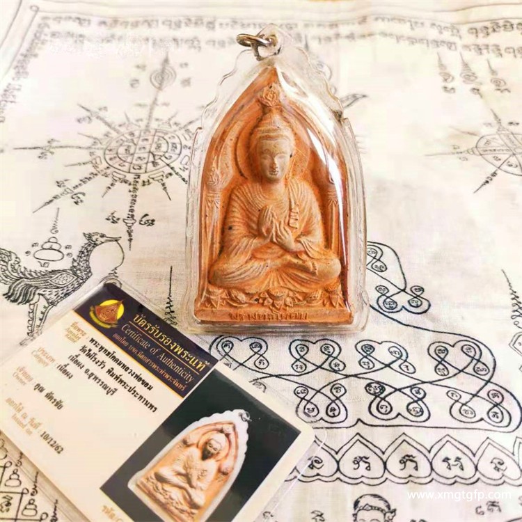 于Wat.Po La Lam寺庙加持“拈花佛祖圣象”背后龙婆银师傅特别的五芒星经文,并有三个升级“Na”经文塔。佛陀法相为2500佛祖诞辰2500年的特别法相,佛陀面相极美,心生吉祥。龙婆银(十方佛)2505“拈花佛祖圣象”
