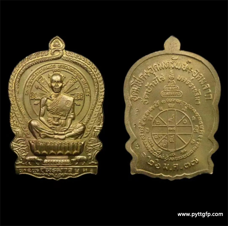 纯金版,发行199尊,是以套装形式发行,一套5枚,包含纯金,纯银,九宝铜,黄铜,以及红铜,这一套里的每一尊背面的编号以泰语雕刻,如下图纯金背面数字是泰语的20,与普通版的阿拉伯数字有所区别: