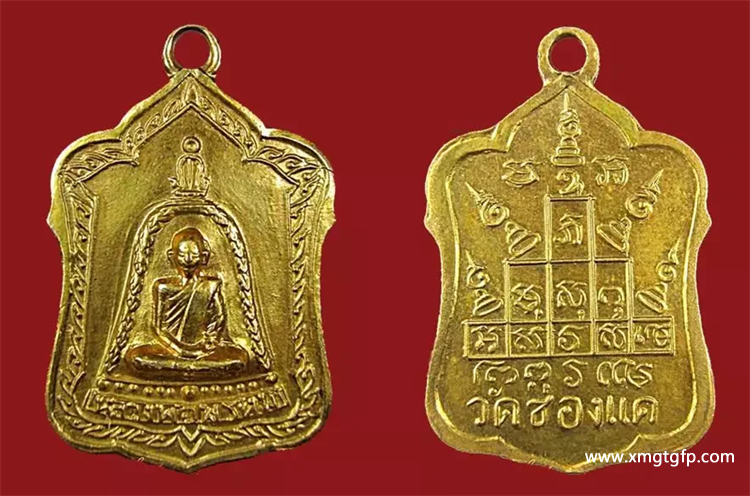 同样是非常流行的一尊,有两种材质,红铜材质为主流,还有一种葛来汤,类似黄铜的颜色,背面是师傅的佛堂,这一尊牌就是为了纪念佛堂修缮成功,就是2511年开始修建的佛堂,里面是师傅独创的经文,只有一个模发行量10500尊,这一尊佛牌特别殊胜。泰国佛牌 龙婆碰 师傅自身像